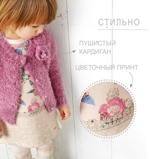 Для маленьких девочек Sarabanda предлагает платье из ворсовой ткани с цветочным принтом. К такому платью хорошо подойдут леггинсы из хлопка стрейч с цветочной отделкой, создающей эффект ручной вязки. Комплект дополнен теплым и мягким на ощупь пушистым трикотажным кардиганом, который непременно должен быть в гардеробе каждой девочки в этом осенне-зимнем сезоне.