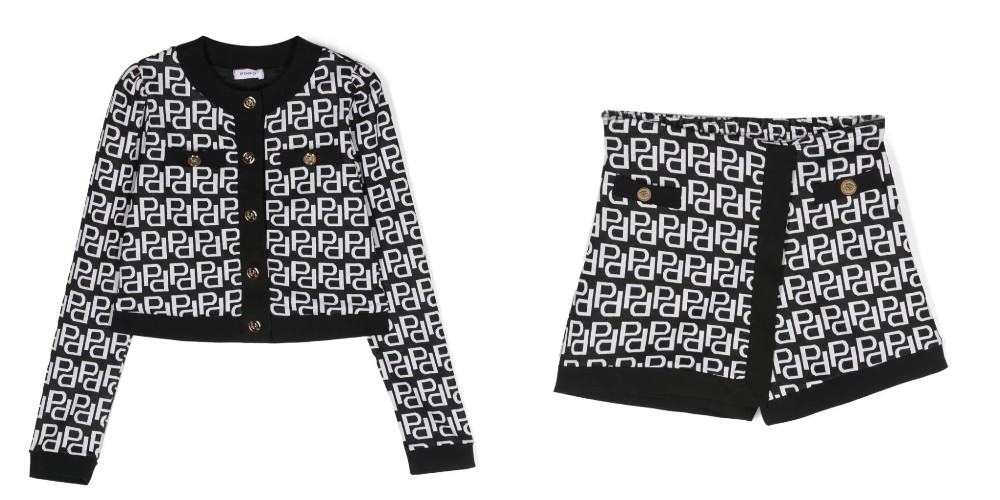 Отдельно хотим отметить в коллекции элегантный костюм в стиле Шанель с принтом логотипа: он замечательно будет смотреться на предстоящих праздниках. Также его можно надеть в кафе, кино и даже в школу. Универсальный комплект, который пригодится в девичьем гардеробе!