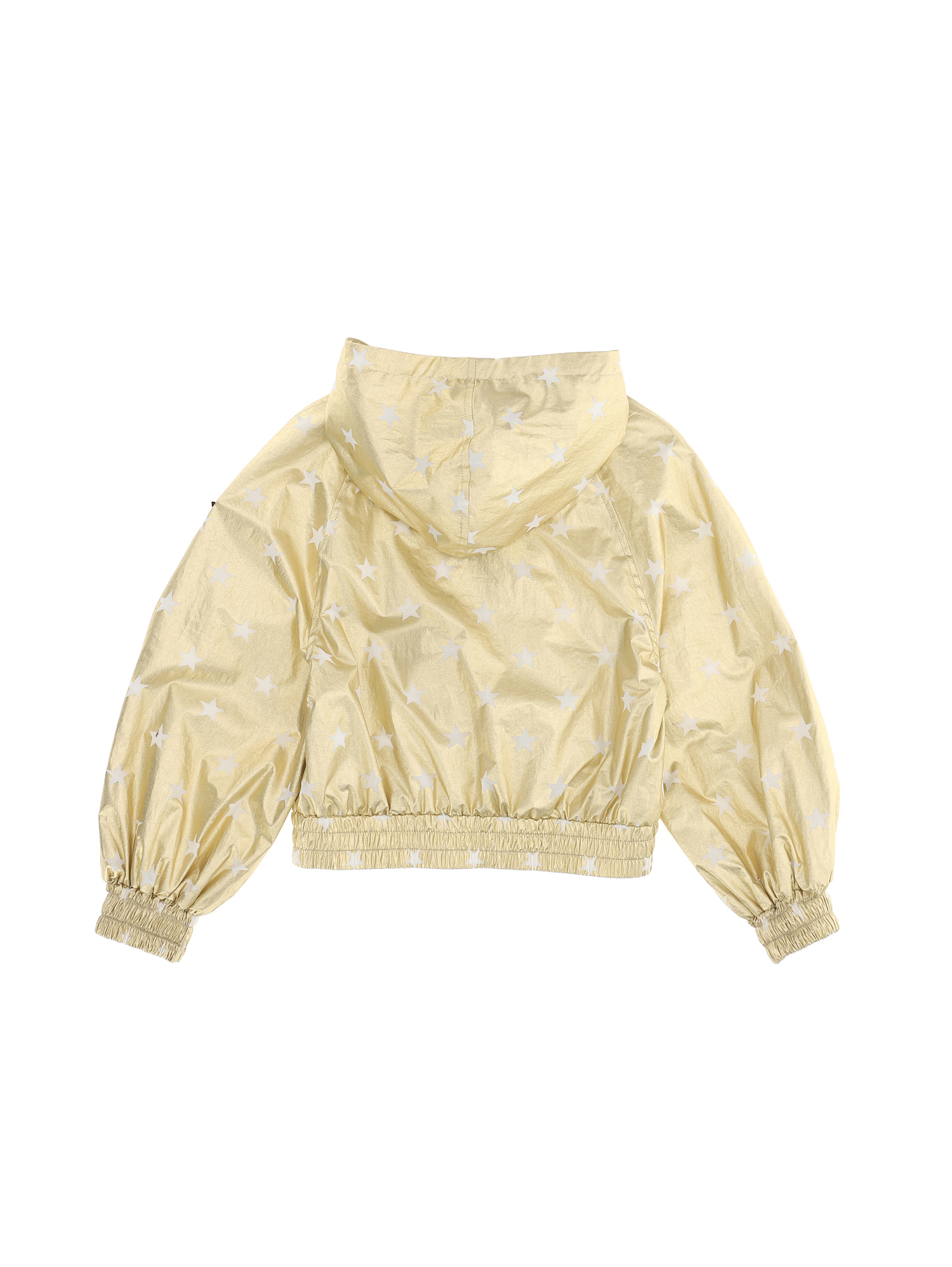 Силуэт прямой, капюшон, застежка - "молния", низ на резинке, принт - "Звезды"..