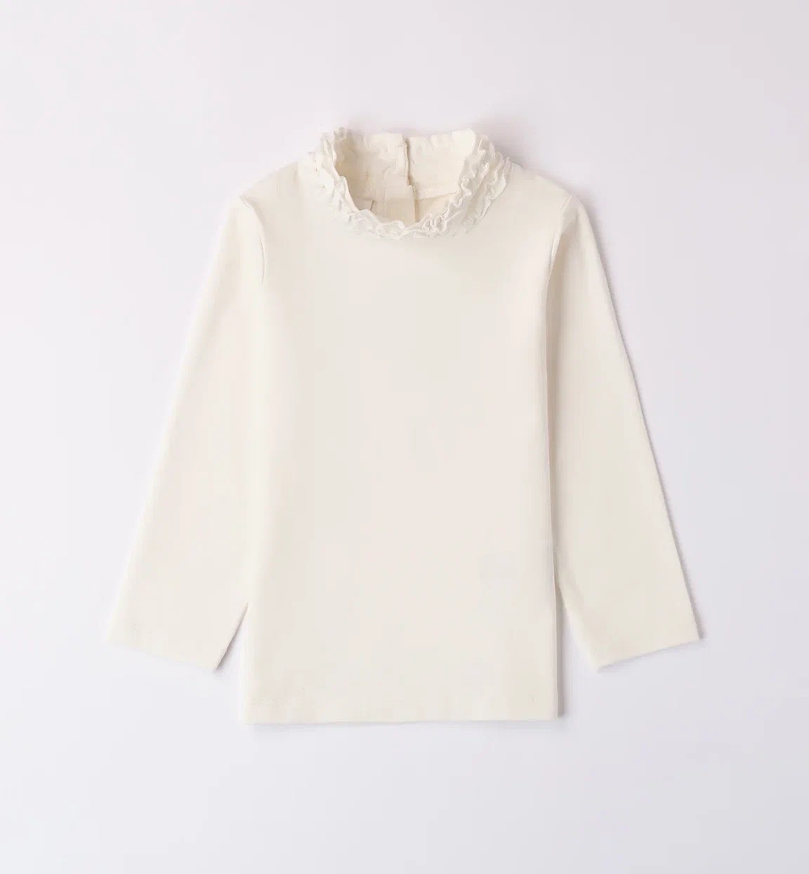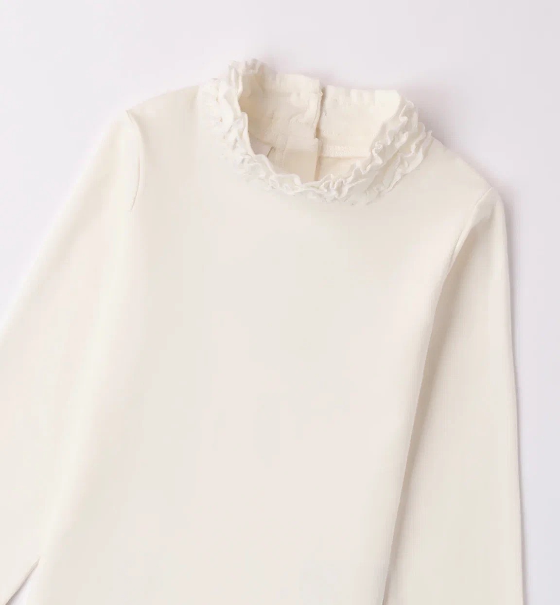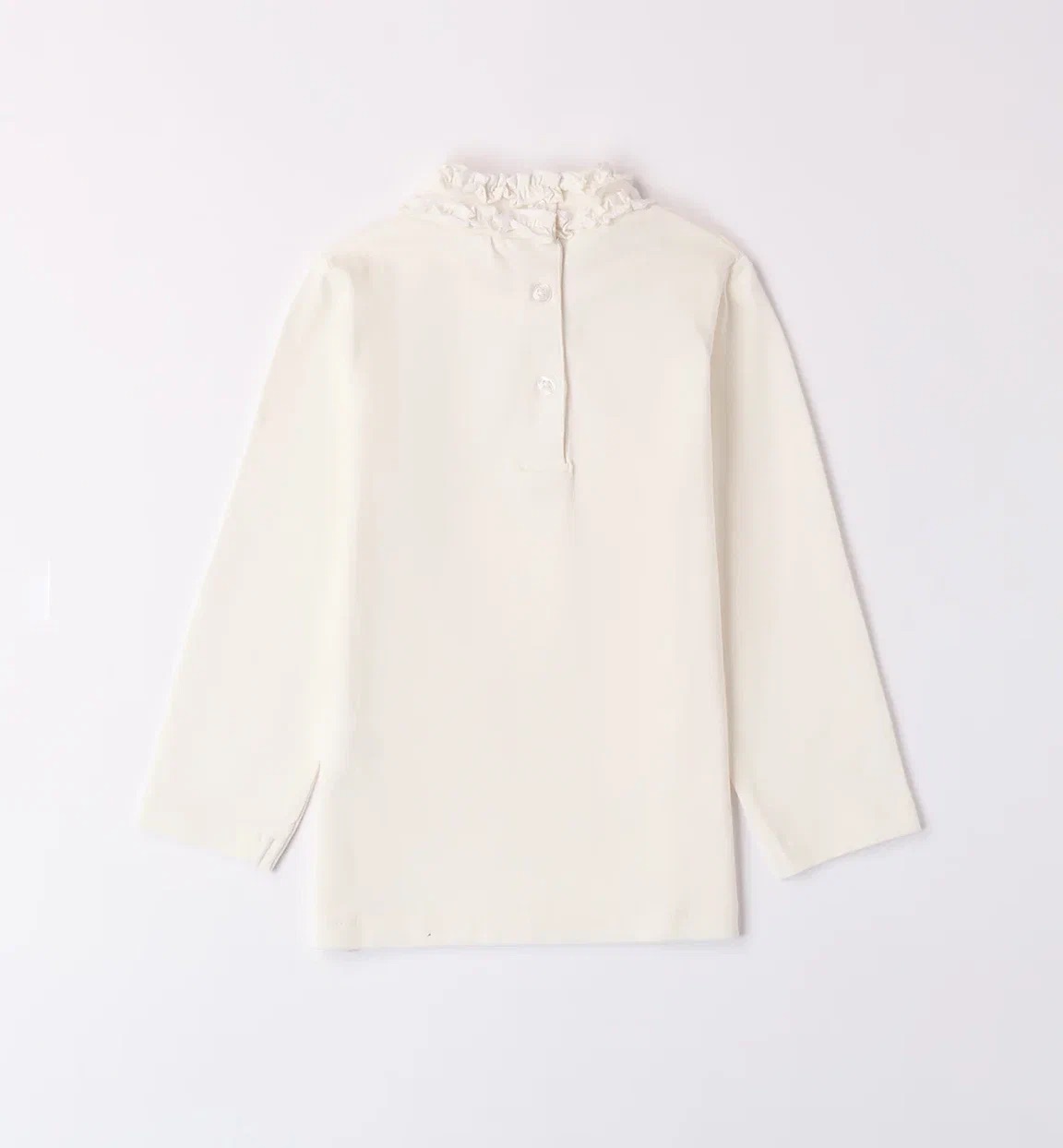 Модель прямая,застёжка сзади кнопки, горловина в рюши, трикотажная.